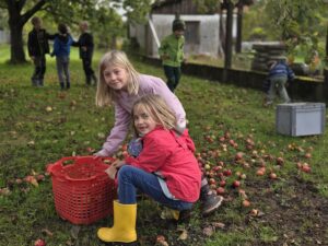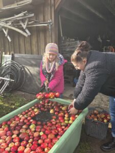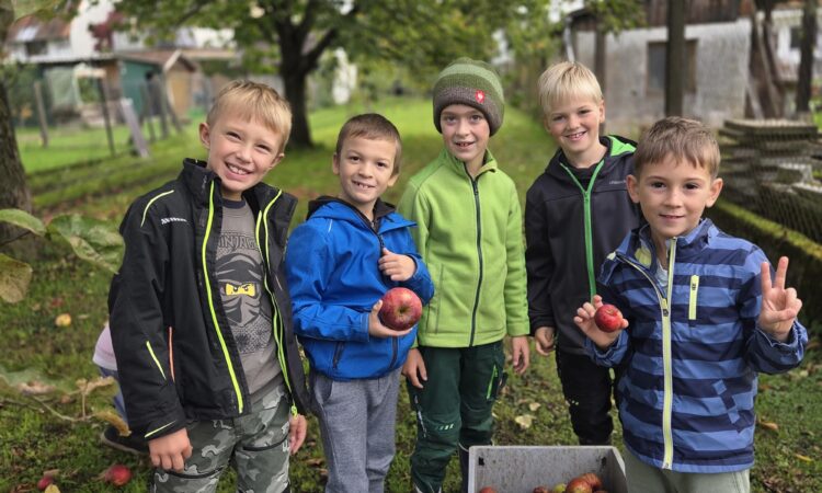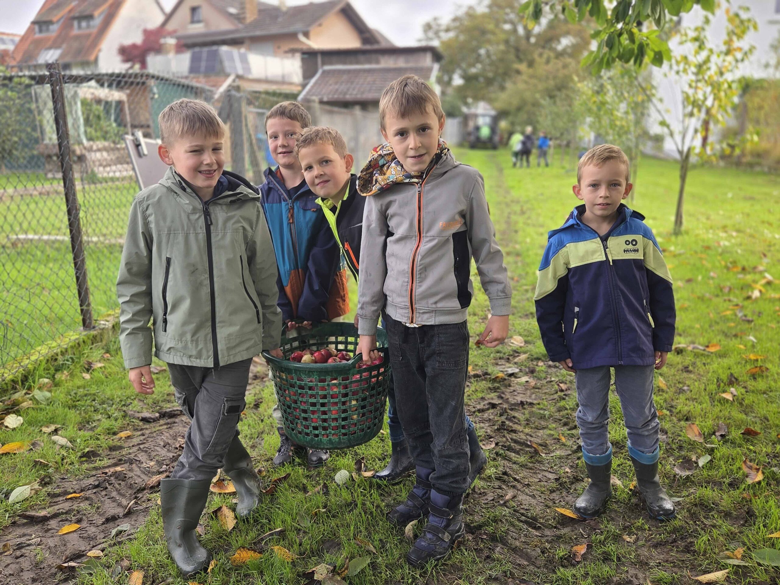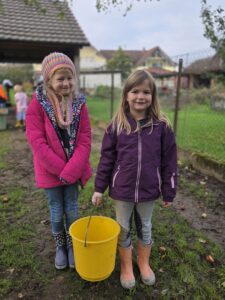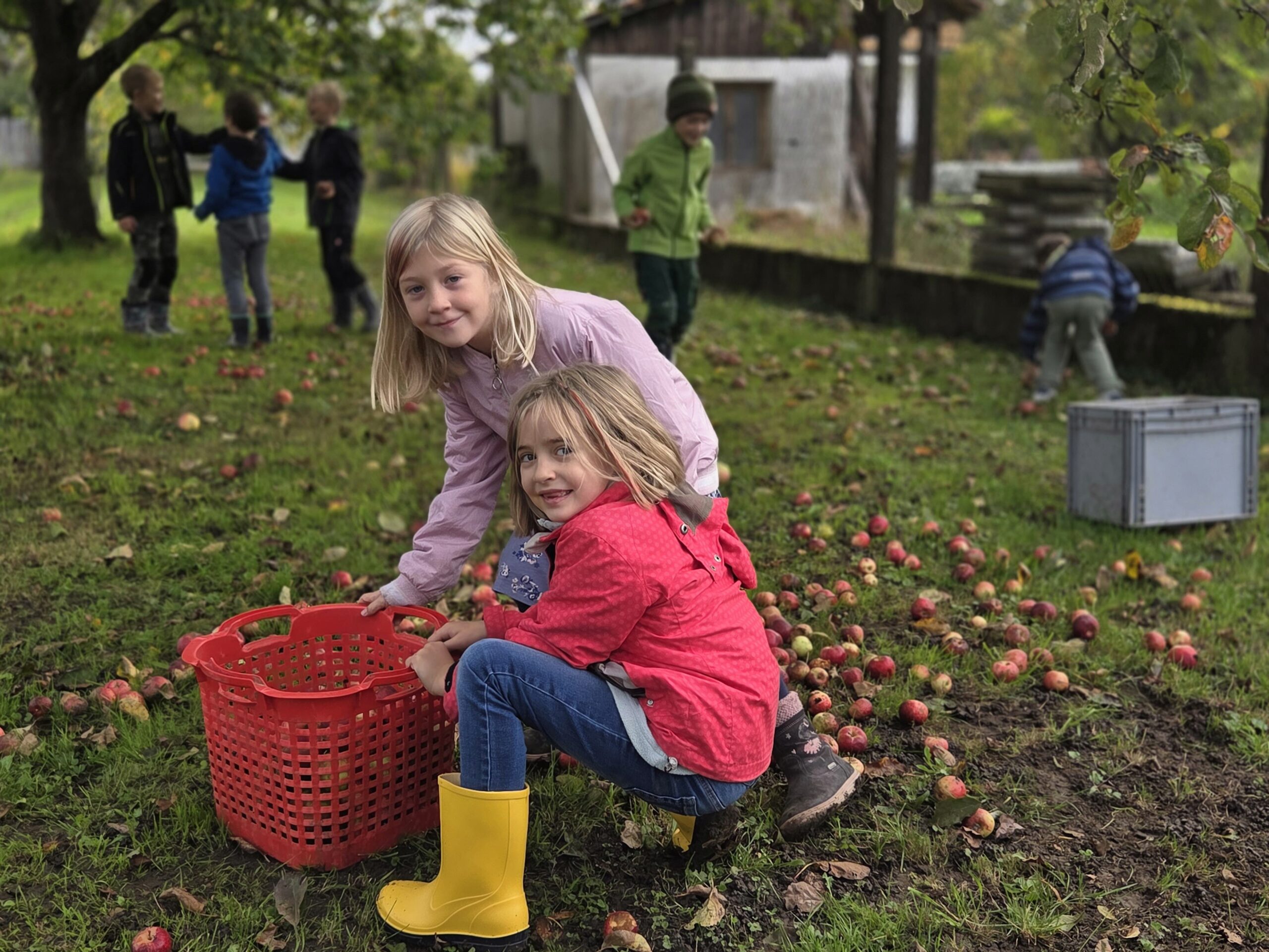 Mit Gummistiefeln ausgerüstet liefen wir heute auf die andere Straßenseite unserer Schule, wo sich der Garten von Familie Emmelmann befindet. Alle waren hoch motiviert und gleich ging es mit Körben los, um die im ganzen Garten verteilten Äpfel einzusammeln. Hier waren unserer Zweitklässler erst einmal gut beschäftigt.