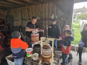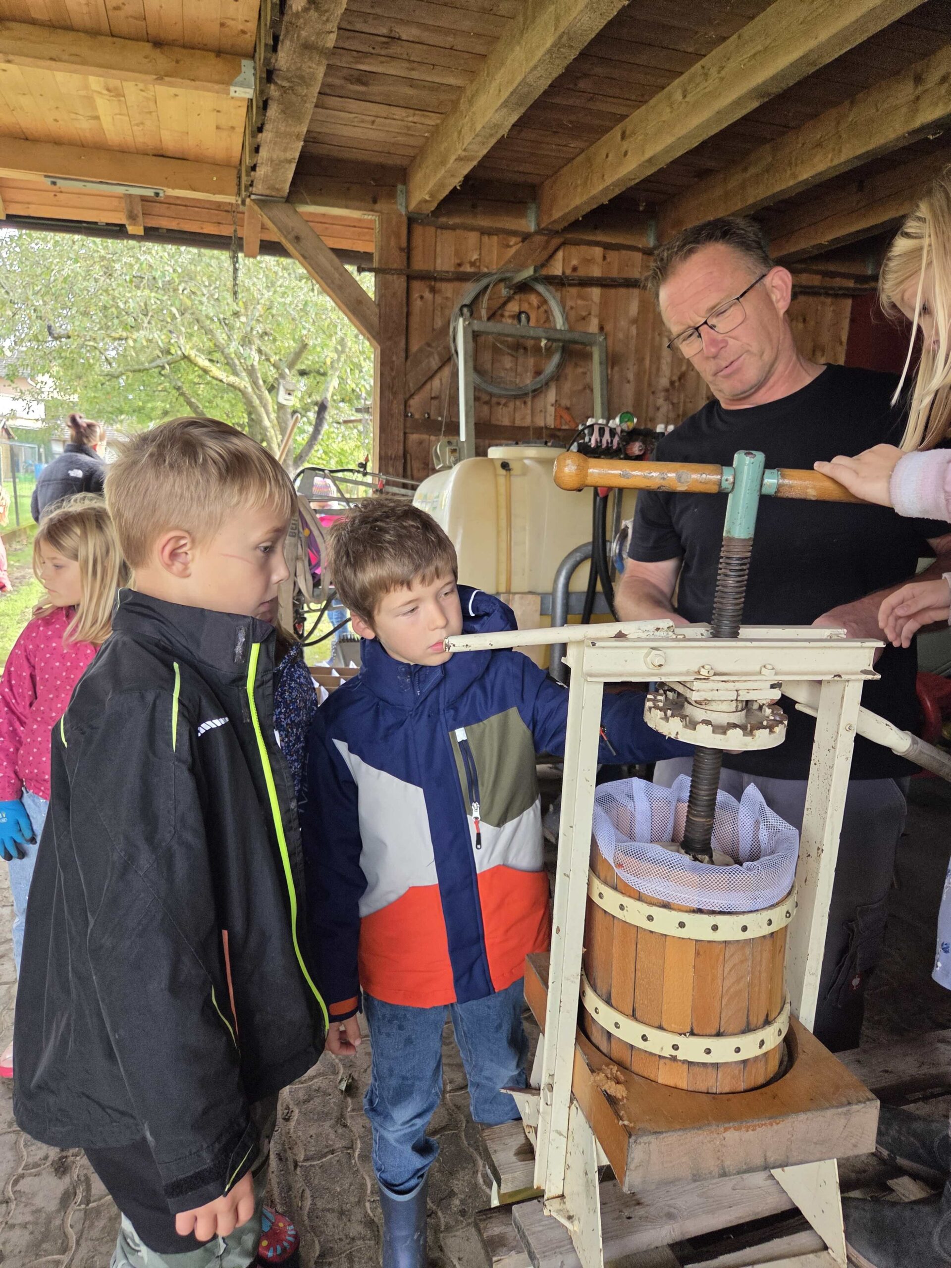 Danach ging es für die Äpfel in einen großen Wassertrog, in dem sie gewaschen wurden. Von dort aus wurden sie elektrisch zerhäckselt. Der daraus entstandene Apfelbrei wurde in zwei von Hand betriebene Obsttrotten gebracht, wo die Kinder dann den eigentlichen Apfelsaft herstellen konnten. Hier musste man kräftig drehen und jeder durfte einmal mit reiner Muskelkraft versuchen, den Saft aus dem Apfelbrei herauszupressen.