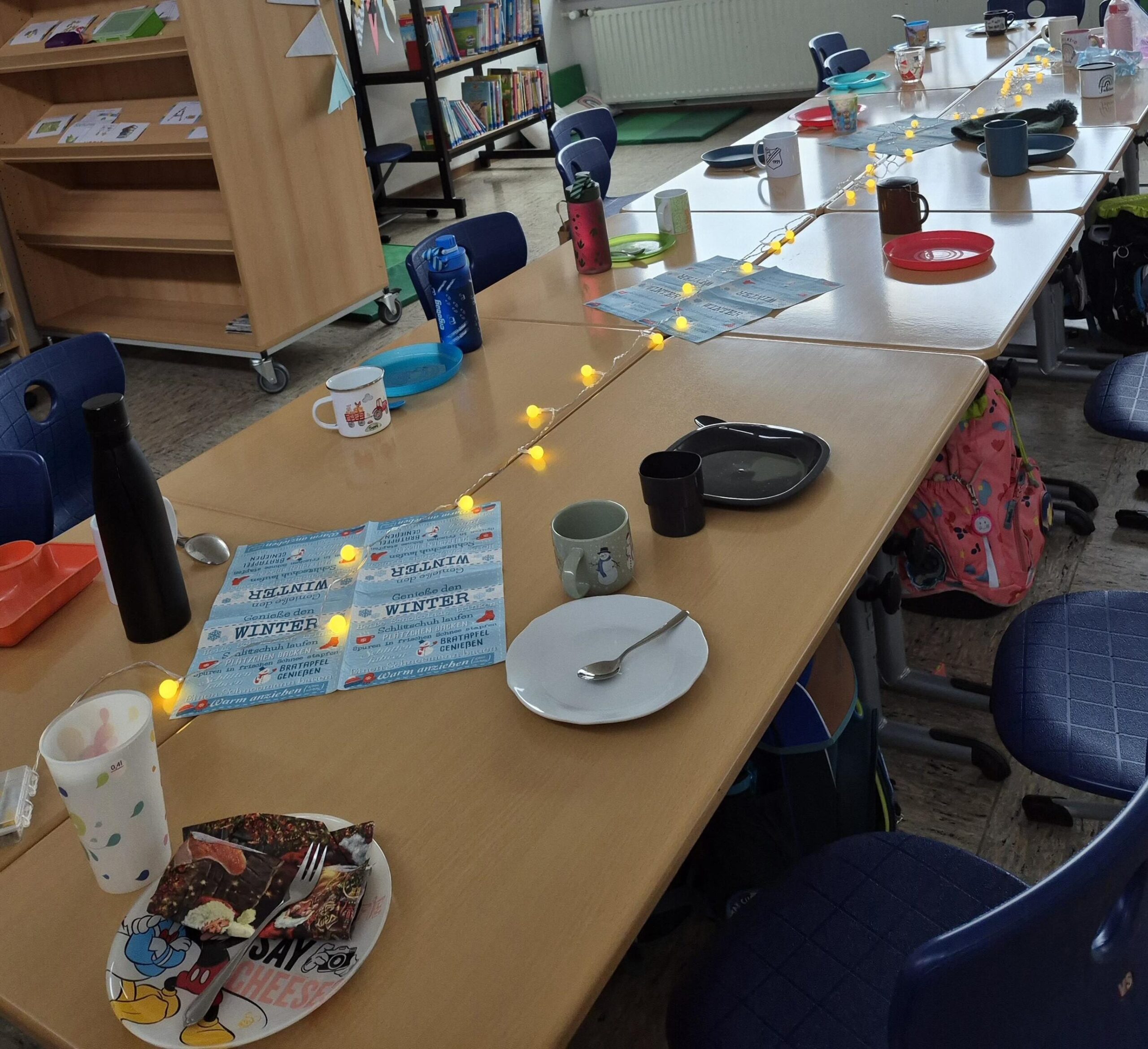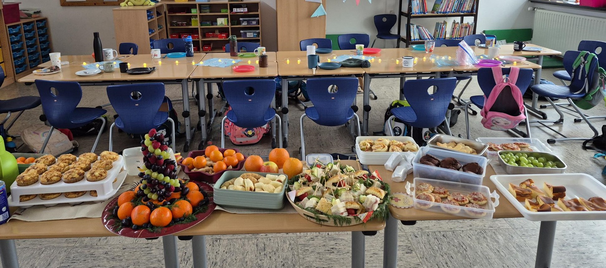 Im Anschluss an einen besinnlichen Gottesdienst ging es im weihnachtlich beleuchteten und geschmückten Klassenzimmer weiter. Um die bevorstehende Zeit gebührend im Klassenkreis zu feiern, erwartete die Kinder ein abwechslungsreiches Adventsbuffet mit allem, was das Herz begehrt.