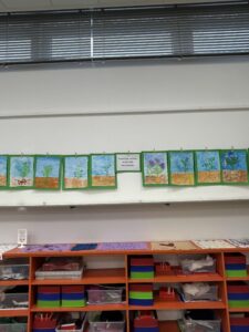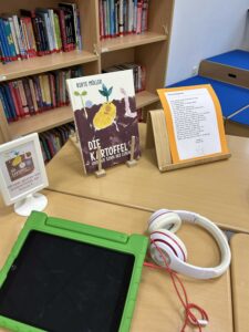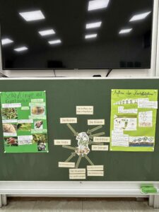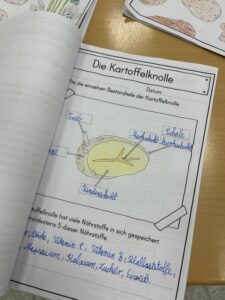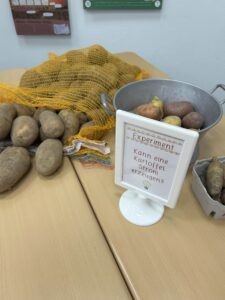 Die Fenster waren festlich mit selbstgebastelten Origami-Blättergirlanden dekoriert, die die herbstliche Stimmung unterstrichen. Zudem konnten die Besucher beeindruckende Kunstwerke von Kartoffelpflanzen und Kartoffelkäfern bewundern. Die Kinder präsentierten auch interessante Experimente, wie den Versuch mit der Kartoffelbatterie, bei dem sie zeigten, wie man mit einer Kartoffel Strom erzeugen kann. Um die Ausstellung abzurunden, konnten die Besucher Gedichte über die Kartoffel hören und ein selbst aufgenommenes Hörspiel mit dem Titel „Der Sinn des Lebens“ genießen, das zum Nachdenken anregte.