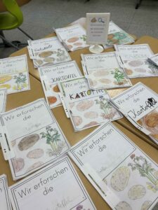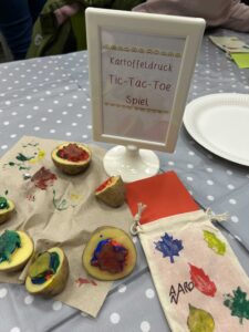 Die Kinder hatten zahlreiche kreative Stationen vorbereitet. Sie gestalteten Tischdecken und Windlichter mit Kartoffeldruck, die die Tische während des Festes schmückten. An einer weiteren Station konnten die Besucher ein Tic Tac Toe Spiel selbst gestalten, ebenfalls mit Kartoffeldruck. Ein Highlight der Ausstellung war die selbstgekochte Kartoffelsuppe, die die Schüler mit großer Begeisterung zubereiteten und den Besuchern servierten. Auch ein köstlicher Kartoffel-Nuss-Kuchen fand großen Anklang und rundete das kulinarische Angebot ab.