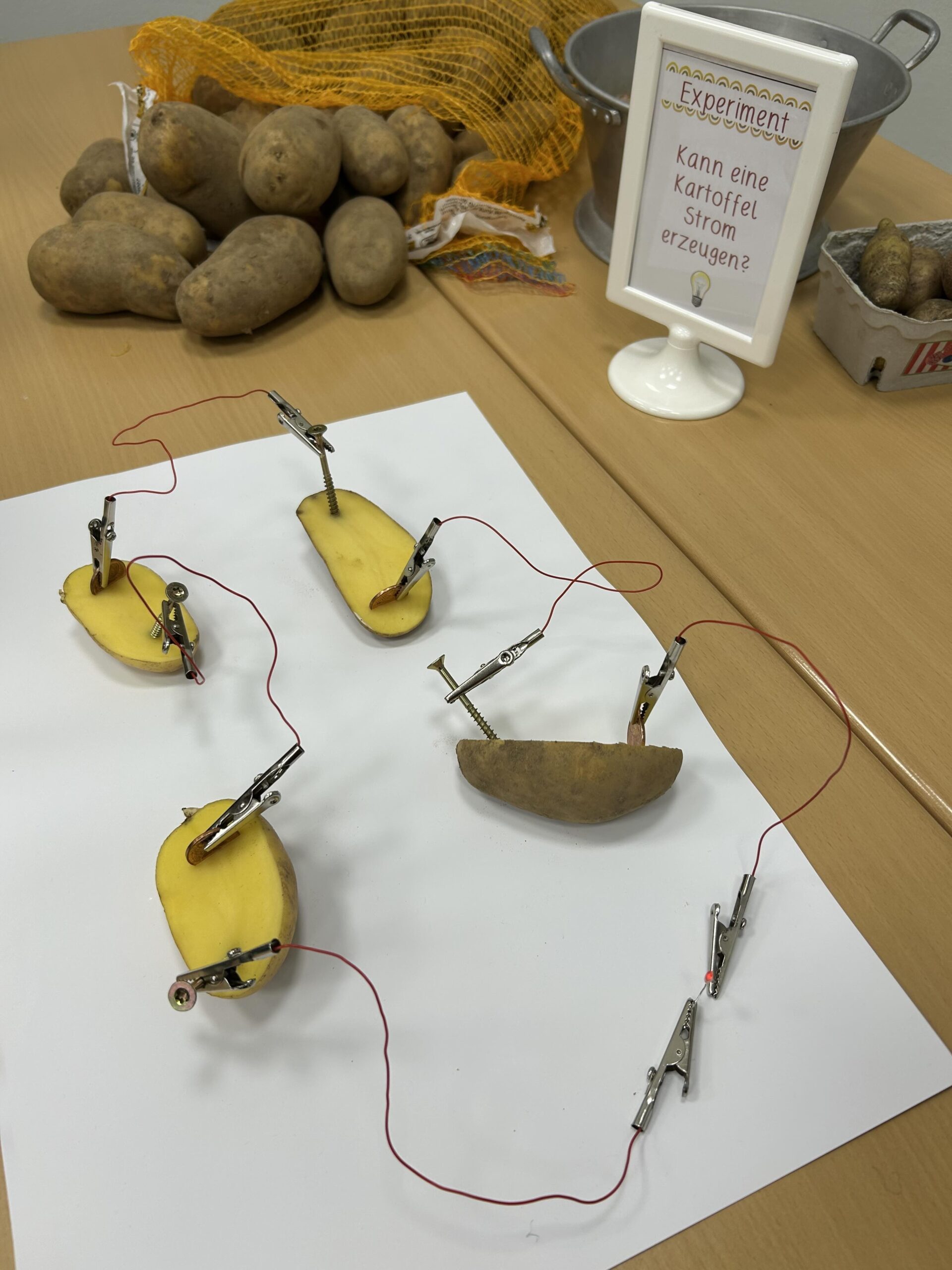 Die Fenster waren festlich mit selbstgebastelten Origami-Blättergirlanden dekoriert, die die herbstliche Stimmung unterstrichen. Zudem konnten die Besucher beeindruckende Kunstwerke von Kartoffelpflanzen und Kartoffelkäfern bewundern. Die Kinder präsentierten auch interessante Experimente, wie den Versuch mit der Kartoffelbatterie, bei dem sie zeigten, wie man mit einer Kartoffel Strom erzeugen kann. Um die Ausstellung abzurunden, konnten die Besucher Gedichte über die Kartoffel hören und ein selbst aufgenommenes Hörspiel mit dem Titel „Der Sinn des Lebens“ genießen, das zum Nachdenken anregte.