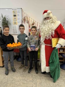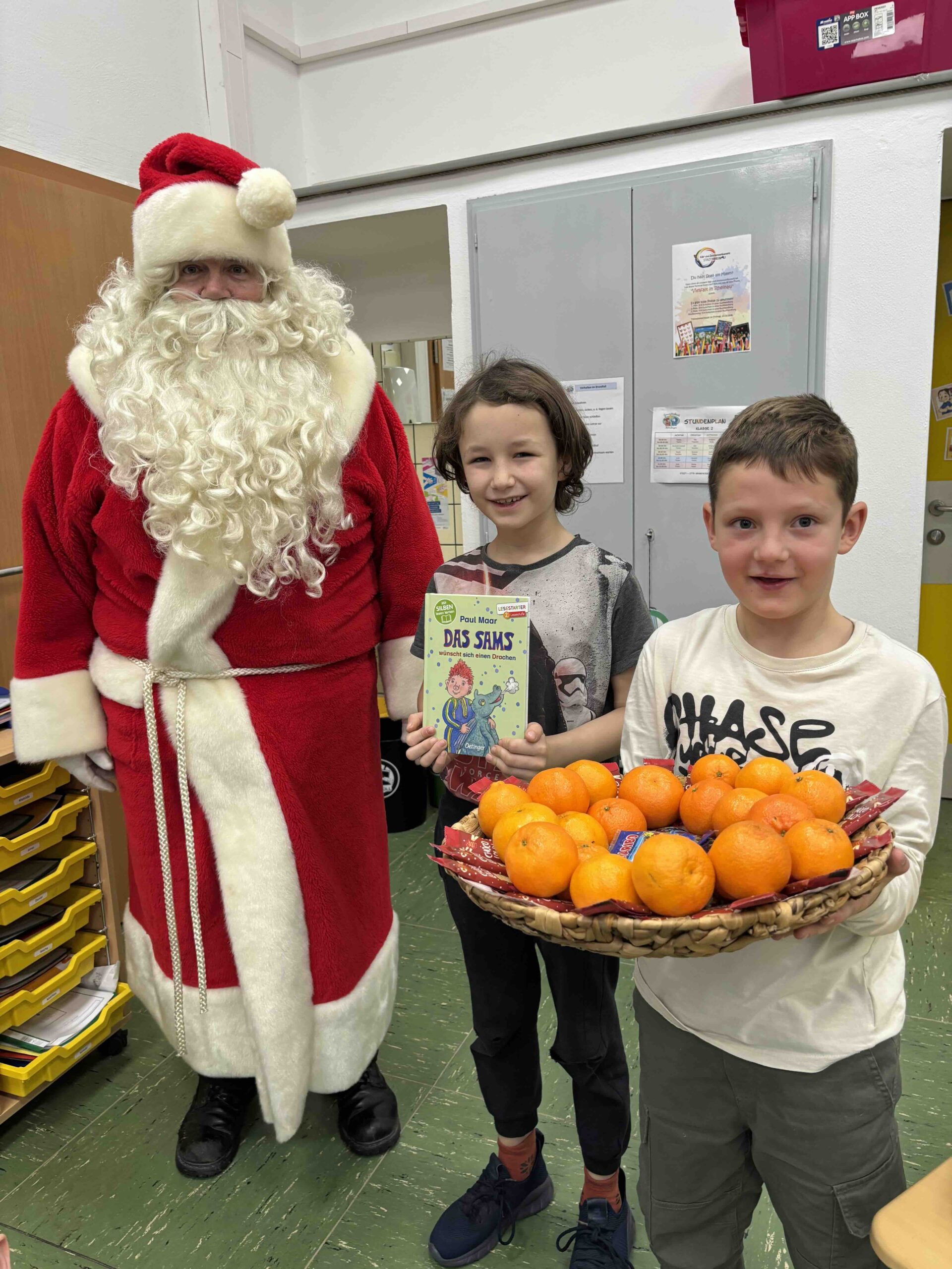 Die Erstklässlerinnen und Erstklässler waren der Meinung, dass auch der Nikolaus für seine Mühen belohnt werden sollte. Wer immerzu schenkt, der soll auch einmal etwas bekommen. Demnach wurde dem bärtigen Mann zu seiner Überraschung (und Freude!) ein Plakat mit selbst gebastelten Nikoläusen, aufgeklebten Sternen und einem abgeschriebenen Gedicht überreicht: