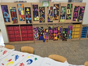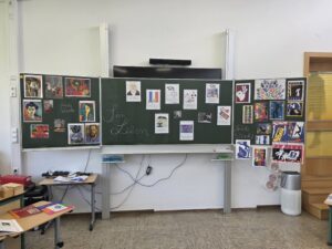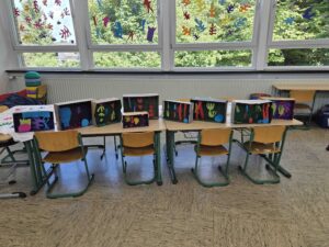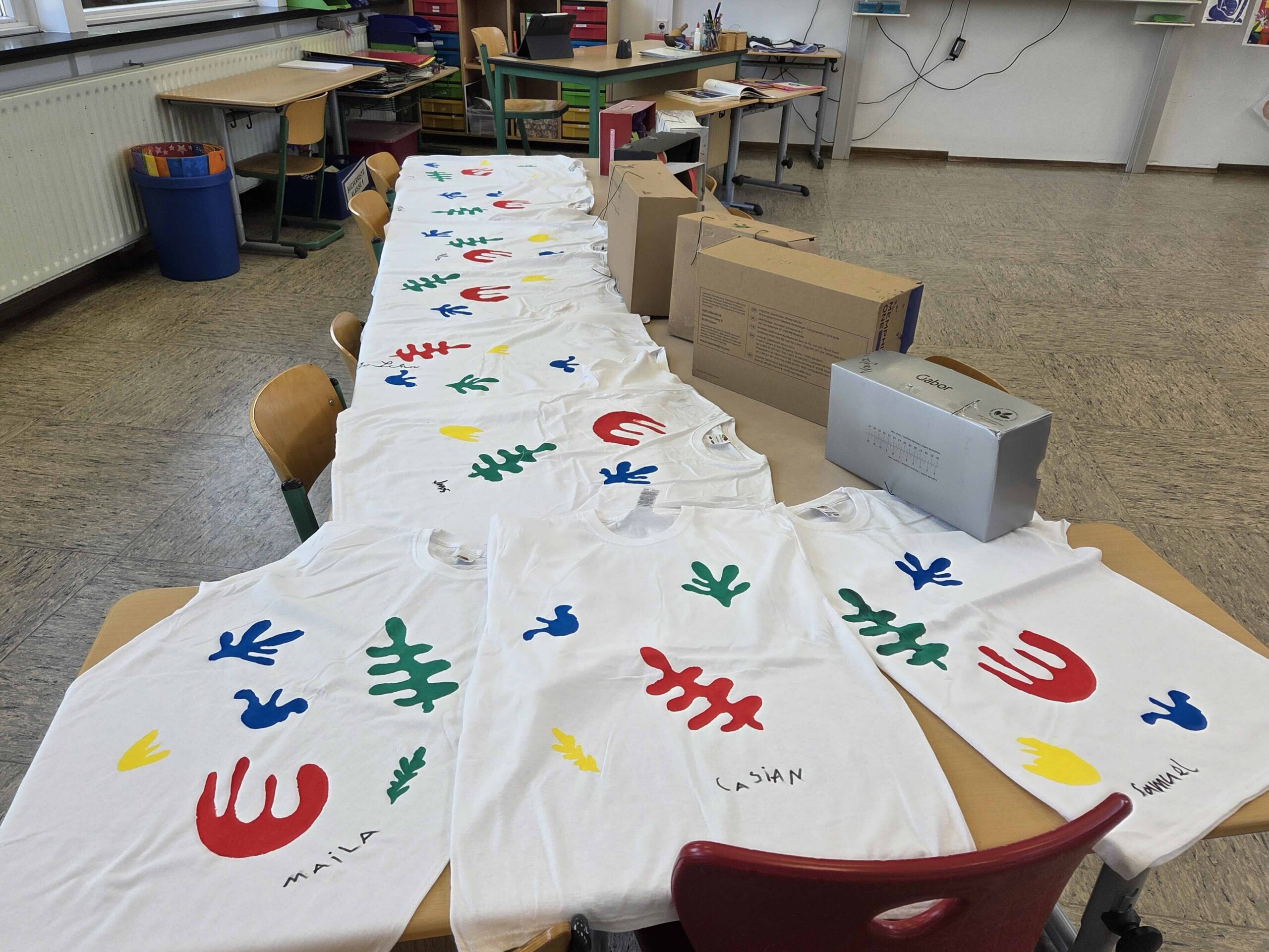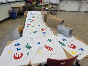 Der Freitag diente hauptsächlich der Fertigstellung der T-Shirts, die immer wieder zwischendurch mit den einzelnen Kindern bemalt wurden – natürlich ganz im Stile von Matisse – und des Flipbuches, das jedes Kind einzeln zu Matisse angefertigt hat, und in dem wir die wichtigsten Informationen zum Künstler festgehalten haben. Zum Schluss verwandelten wir unser Klassenzimmer noch in eine kleine Künstlergalerie, in dem alle Werke ausgestellt wurden und beendeten den Schulmorgen mit einem Filmbeitrag, in dem wir uns mit der Frage auseinandersetzten: Was ist eigentlich Kunst?