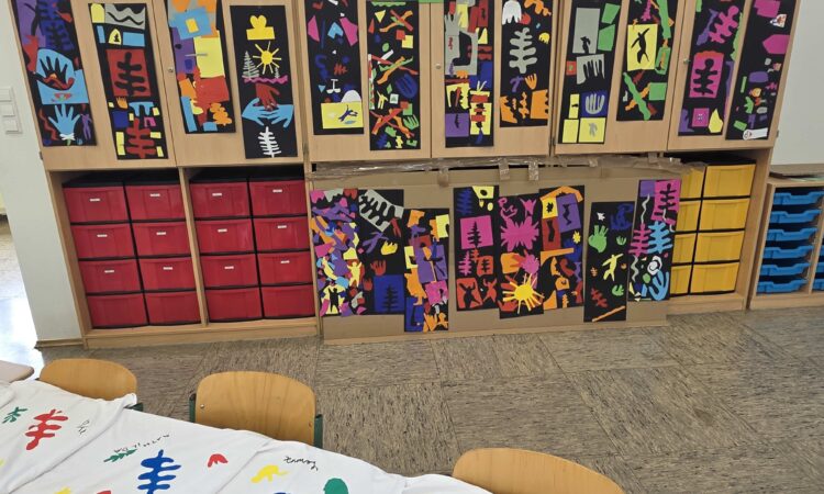 Am vierten Tag konnten die Kinder bereits kreativ mit den Formen und Farben von Matisse umgehen. Sie arbeiteten frei in Gruppen, erarbeiteten Formen und Farbzusammenstellungen, die dann an den Fenstern des Klassenzimmers zu Werken ähnlich derer von Matisse ihren Platz fanden.