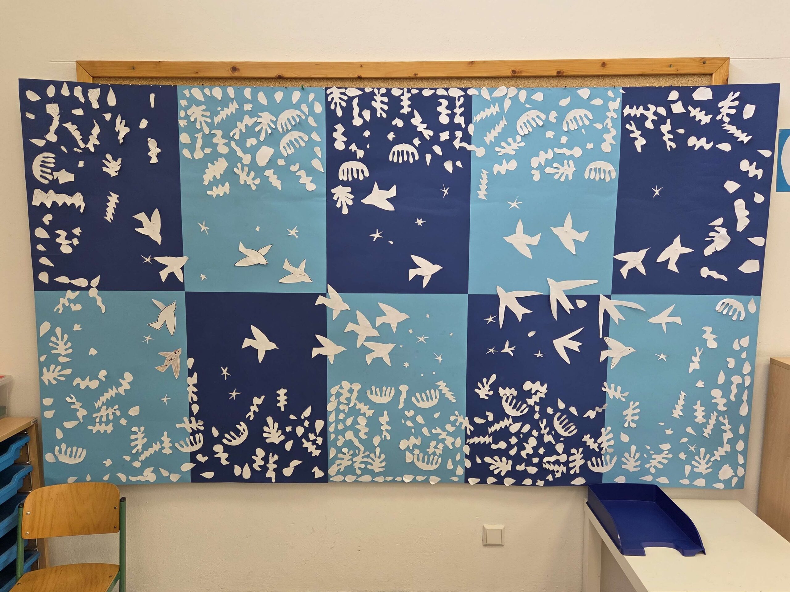 Am Mittwoch waren wir bereits tief in der Thematik angekommen und beschäftigten uns nun mit dem Buch „Matisse und sein Garten“, welches uns zu einem Gemeinschaftsprojekt brachte. Auf blauem Hintergrund klebten wir Formen aus dem Garten, darunter verschiedene Pflanzen und Tiere, die durch den Kontrast von blau und weiß den Fokus besonders auf die Formen lenkte und auf das gemeinschaftliche Arbeiten. Nicht die Individualität, sondern das Gesamtwerk der Klasse bringt hier eine besondere Wirkung zur Geltung.