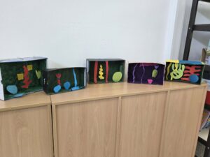 Am Dienstag lag die Tiefe seiner Bilder im Vordergrund. Die scheinende Dreidimensionalität einiger Werke gab uns die Inspiration für unsere „Kunstwerke in der Schuhschachtel“, die die Dreidimensionalität nochmal gesondert in den Vordergrund bringen sollte.