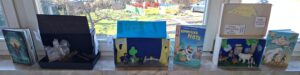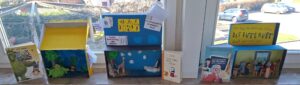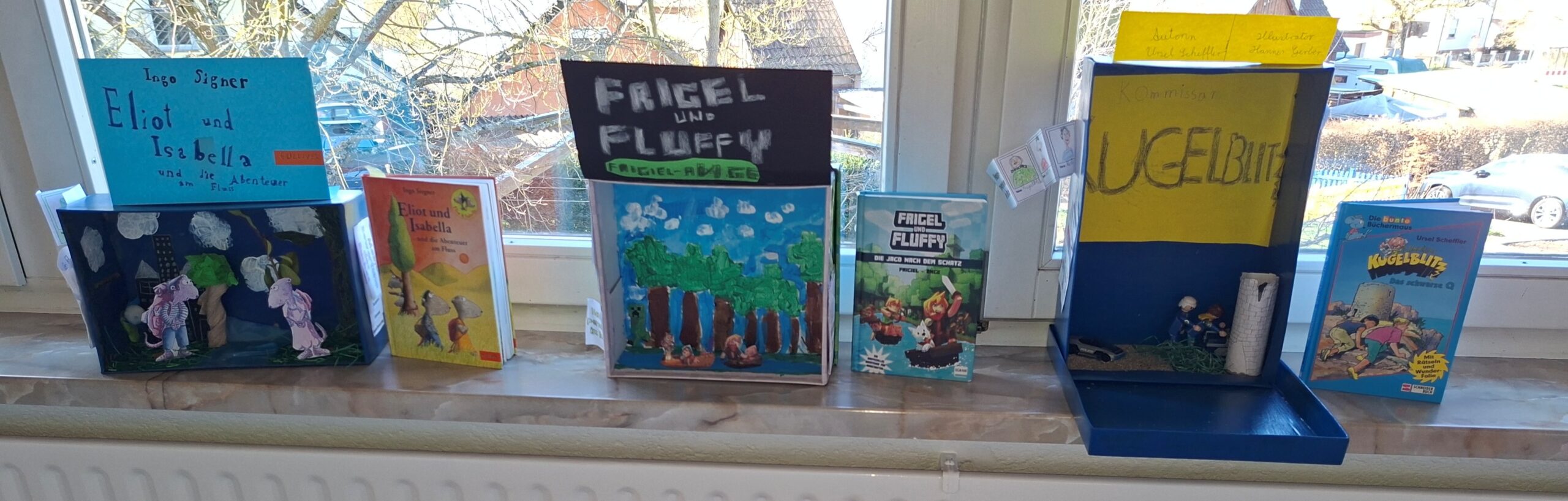 In einer liebevoll gestalteten Kiste stellten die Schülerinnen und Schüler eine Szene aus ihrem Buch dar. Schon von außen waren der Titel sowie der Autor und Illustrator des Buches gut erkennbar. Seitlich befand sich eine kleine Tasche, in der die Kinder eine Inhaltsangabe und eine persönliche Buchempfehlung versteckt hatten.