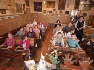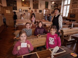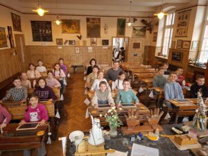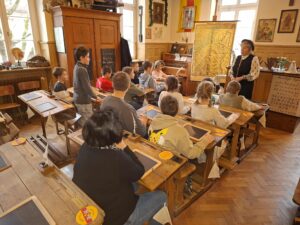 Mit Zug und Bus reisten wir an. Vor Ort empfing uns die „Frau Lehrerin“ und nahm uns mit auf eine spannende Reise in die Schulzeit von früher. Zunächst zeigte sie uns altes Lehrmaterial wie Federhalter und Tintenfass, Schiefertafeln mit Griffeln sowie Leder- und Holzschulranzen. Außerdem konnten die Kinder viele weitere Ausstellungsstücke bestaunen – von ausgestopften Tieren über alte Landkarten bis hin zu einer Nähstube. Zu allem wusste die ehemalige Lehrerin Interessantes zu erzählen.
